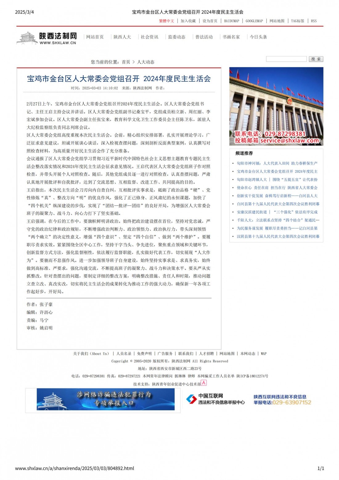 陕西法制网:宝鸡市金台区人大常委会党组召开2024年度民主生活会