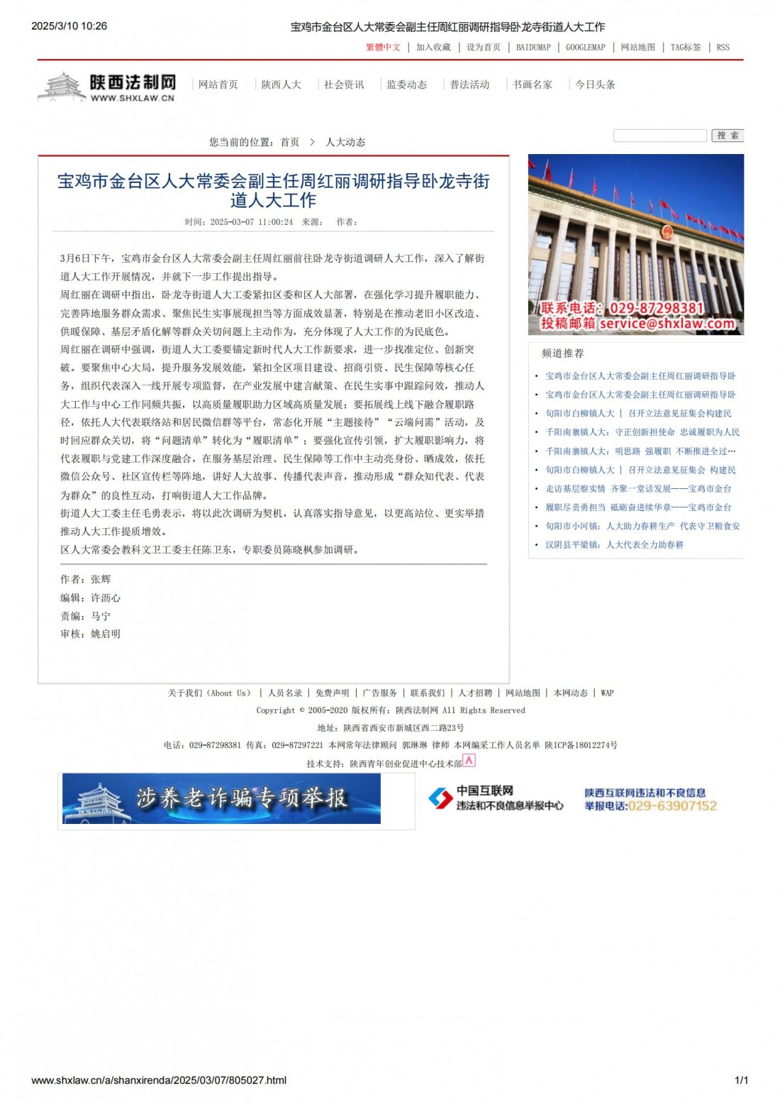 陕西法制网:宝鸡市金台区人大常委会副主任周红丽调研指导卧龙寺街道人大工作